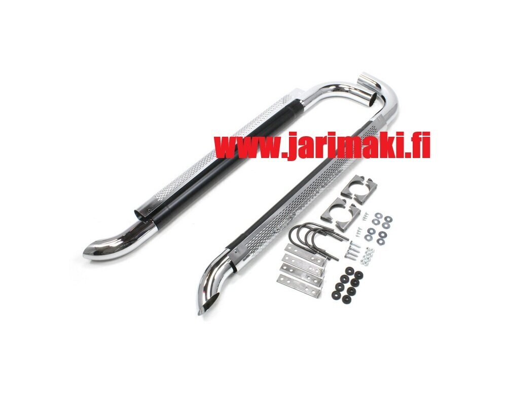 -Kromiset 2-1/2" sisäänmeno putket ja 3" ulkohalkaisijaltaan oleva kromiset pakoputket.