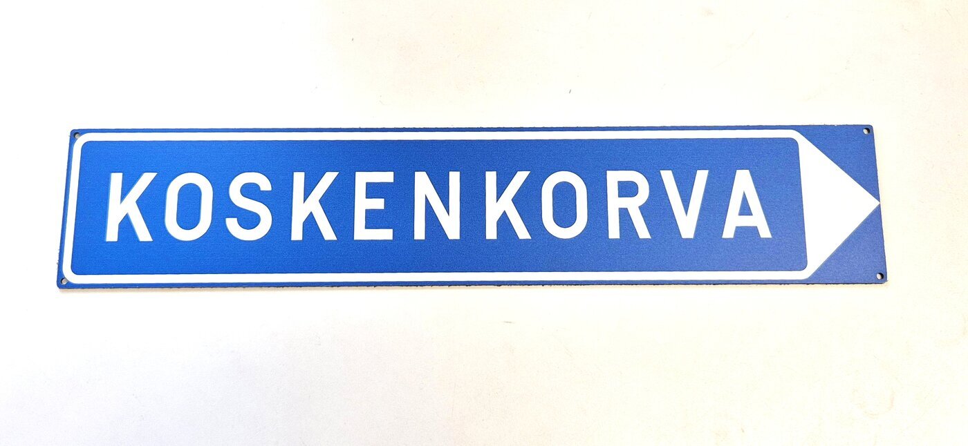 Suomessa valmistettu, liikennemerkin näköinen kyltti, jossa Koskenkorva-teksti.