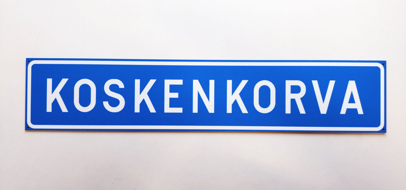 Suomessa valmistettu, liikennemerkin näköinen kyltti, jossa Koskenkorva-teksti.