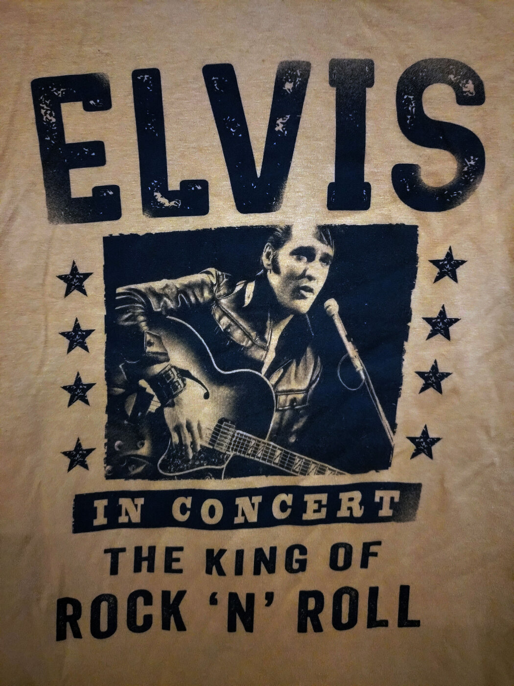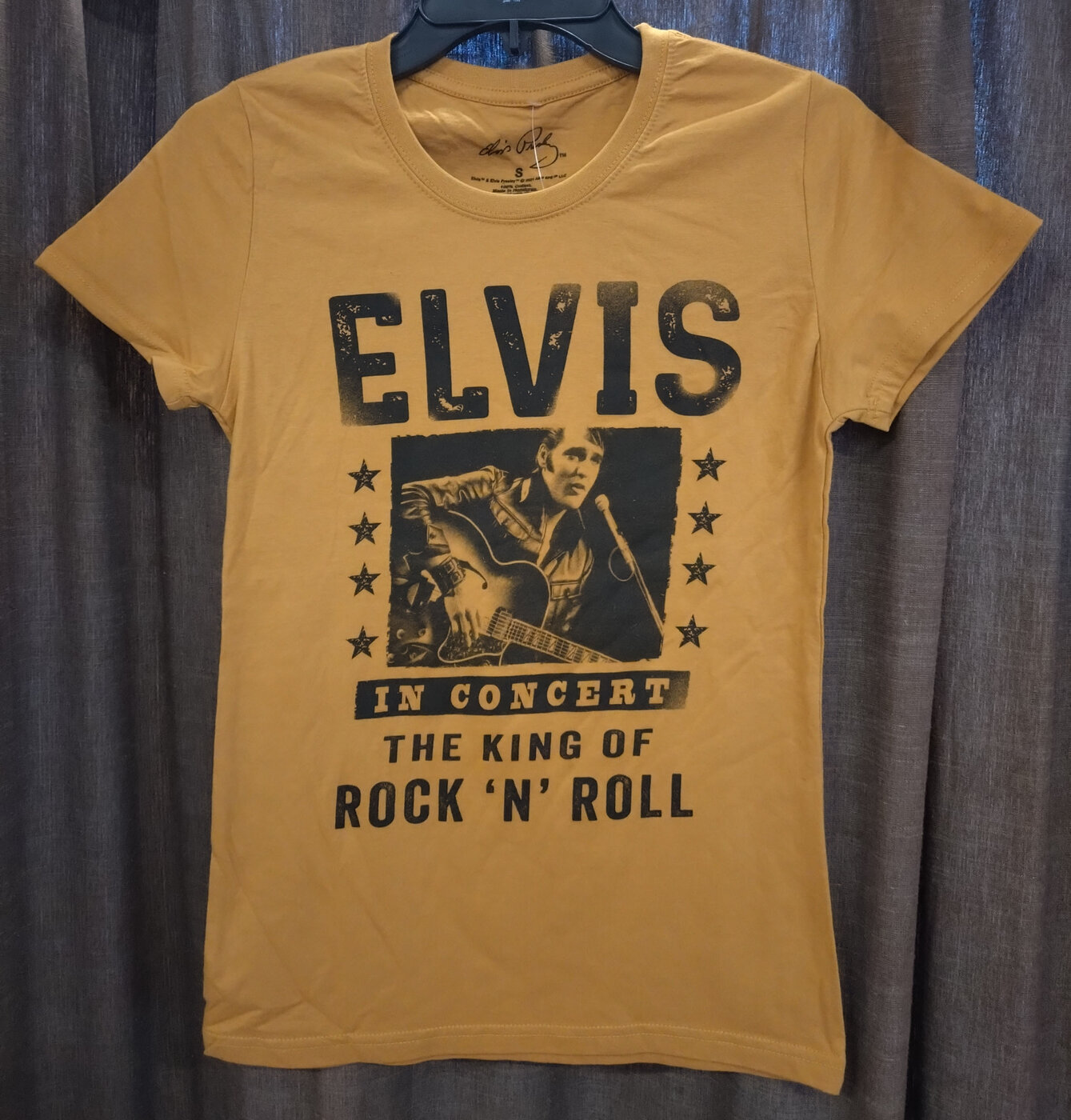 Sinapin keltainen, naisten mallinen t-paita, jossa Elviksen keikkajuliste painatus mustalla edessä.