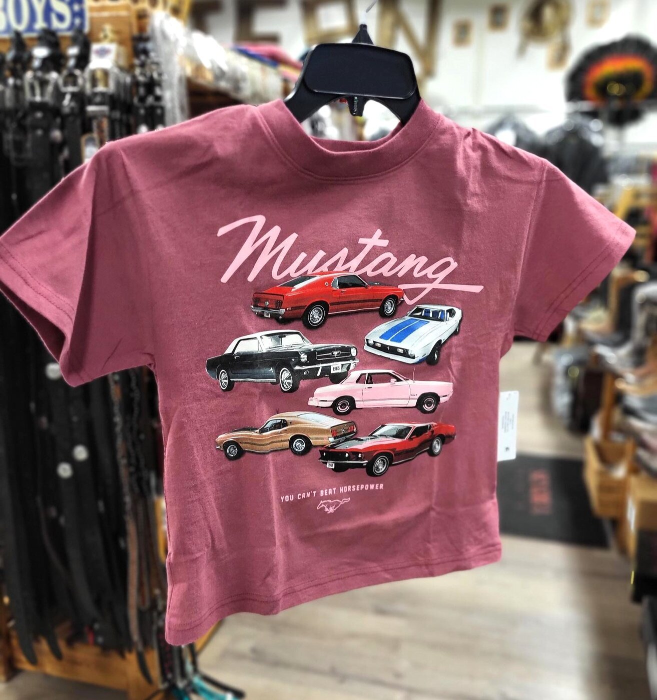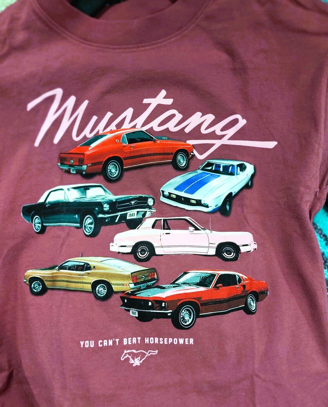 Lasten t-paita jossa painatuksena eri aikakausien Mustangeja. Painatus edessä. Paidan väri nimeltään pesty karpalo (Washed cranberry), parhaiten suomeksi sanottuna kuin haalistunut viininpunainen. Kahdessa ensimmäisessä kuvassa lähinnä sitä väriä mitä on luonnossa, viimeisessä kuvassa näyttää todellista vaaleammalta.