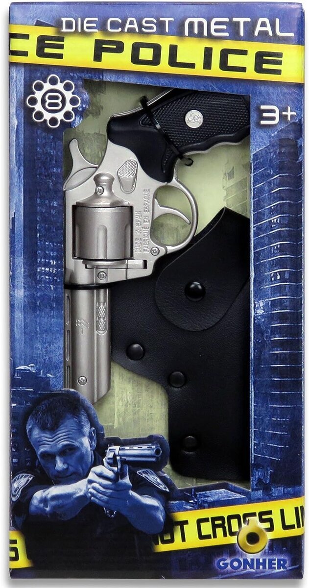 Lasten lelusetti jossa poliisimallinen nallipyssy revolveri ja holsteri.