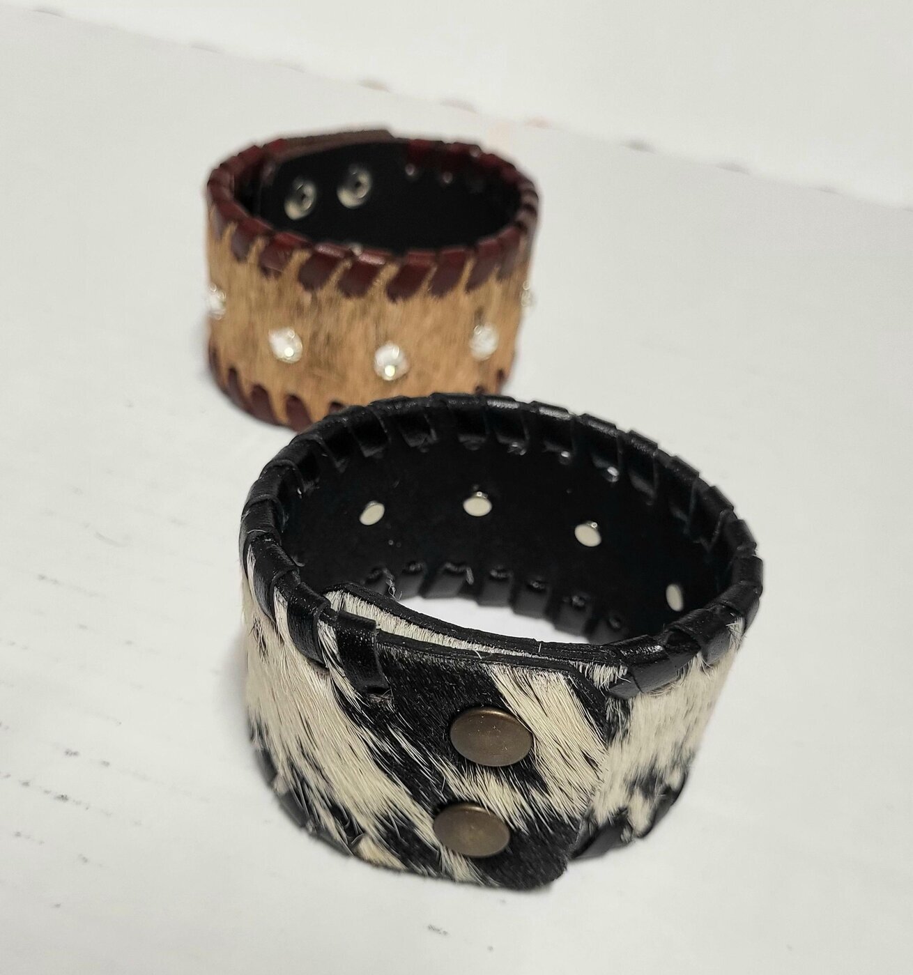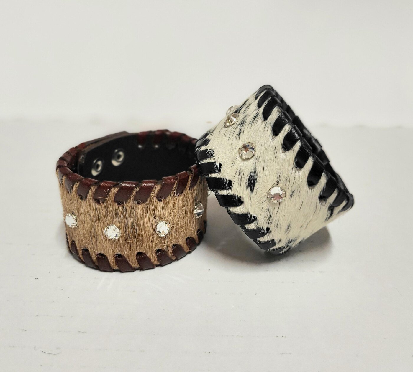 Aidosta lehmäntaljasta tehty ranneke / käsikoru timanteilla. Kiinnitys neppareilla, säädettävä.