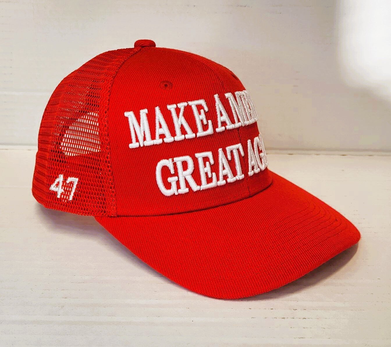 Punainen verkko-lippalakki "Make America Great Again" -sloganilla.