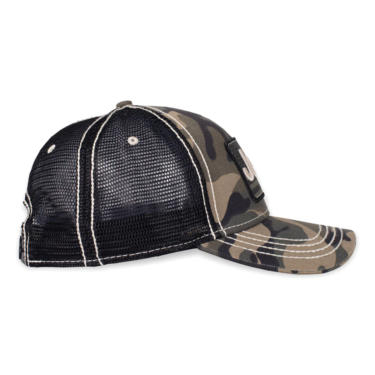 Maastokuvioinen lippalakki valkoisilla saumoilla, jossa edessä Jeep-logo Amerikan lipun päällä. Takaosa mustaa verkkoa.