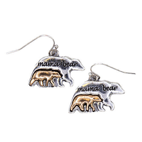 Korvakorut, jossa kaunis hopean värinen karhuemo kullan värisen poikasensa kanssa, teksti Mama Bear.