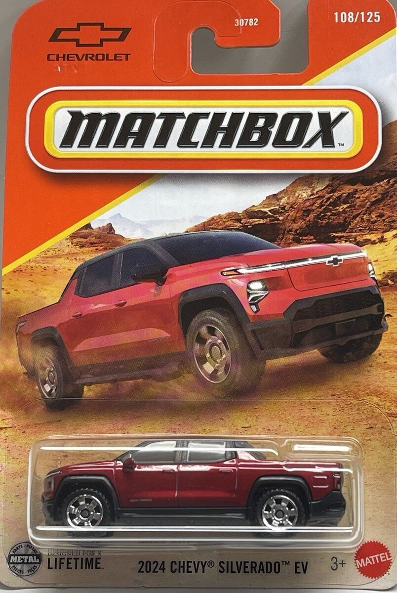 Matchboxin pikkuauto Chevrolet Silverado EV, väriltään viininpunainen.