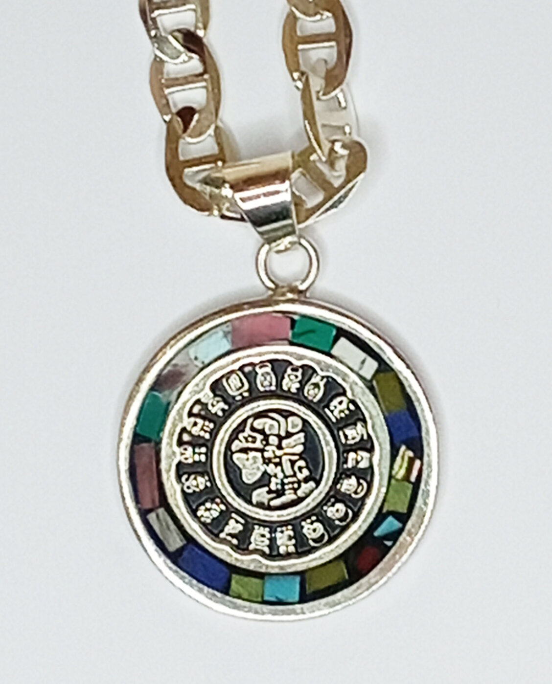 Aito meksikolainen, kaksipuolinen medaljonki, jonka toisella puolella Mayojen kalenteri ja toisella puolella Aztec-kalenteri. Toisella puolella Oranssin ja punaisen sävyisiä koristeluja reunoilla, medaljongin toisella puolella monivärisiä kiviä/ koralleja/ simpukan kuoria.