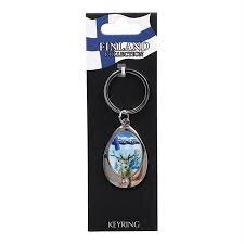 Metallinen avaimenperä, jossa Suomen lipun kuva, teksti Finland sekä kuva Porosta, taustallaan luminen maisema. Kuvan alla pieni pyöreä "timantti".
