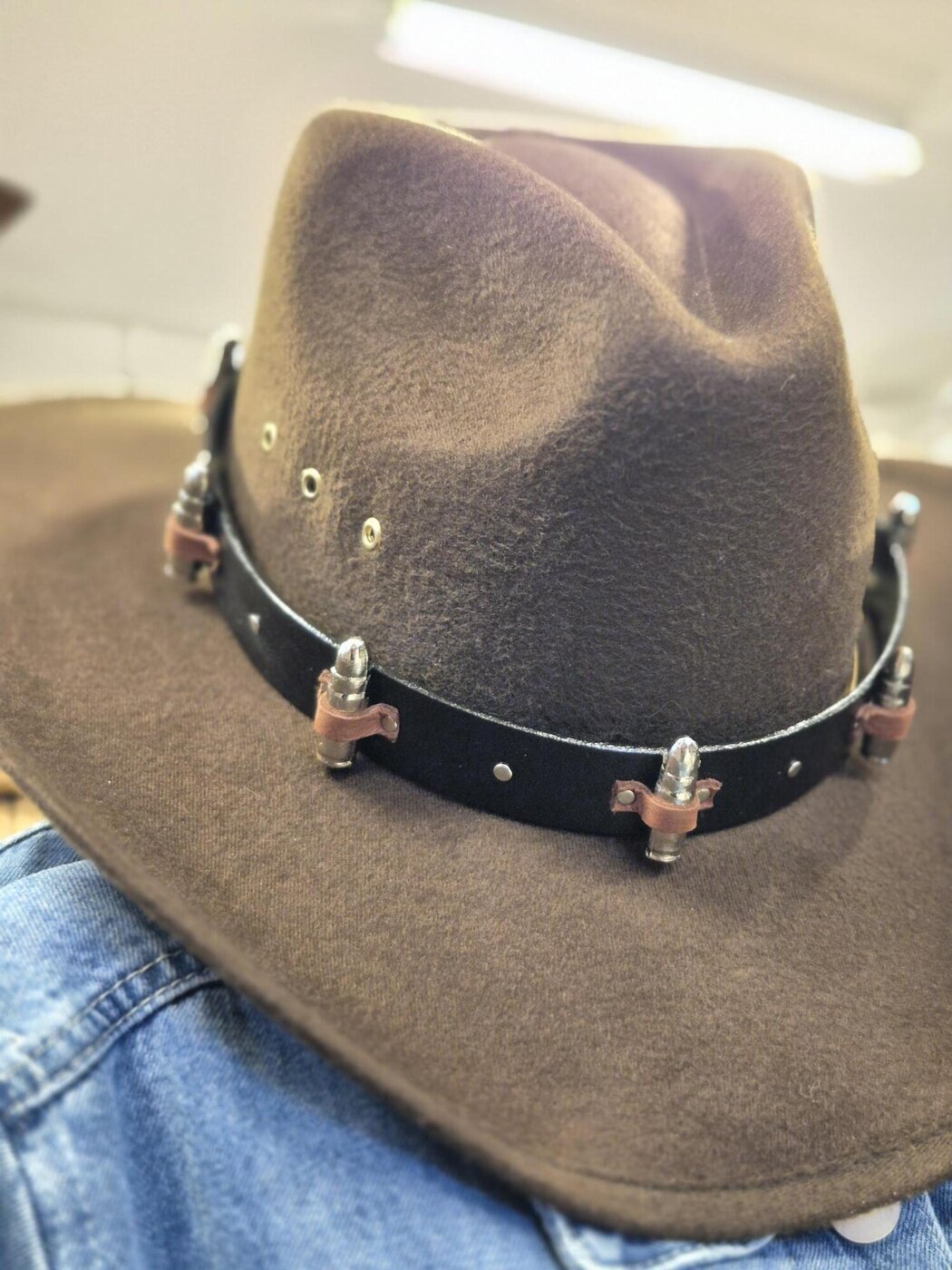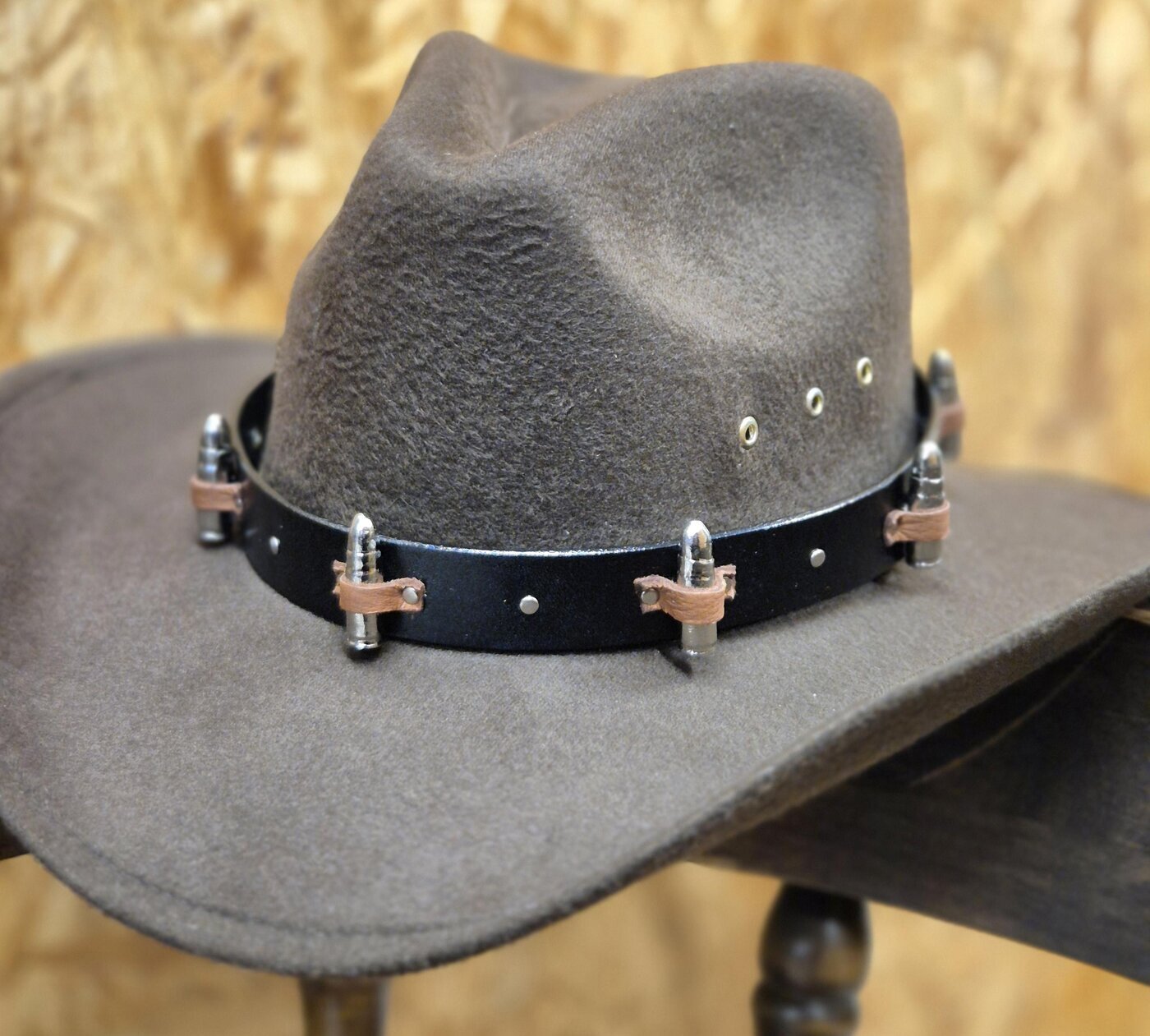 Vaihto-panta westernhattuun. Leveässä mustassa nahkanauhassa 7 luotia kiinnitettynä ruskeilla nahkapaikoilla. Kiinnitys solmittavilla nahkanauhoilla.