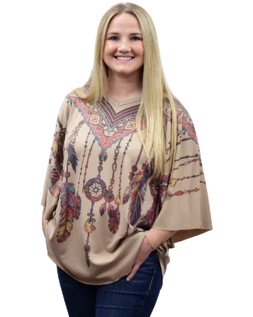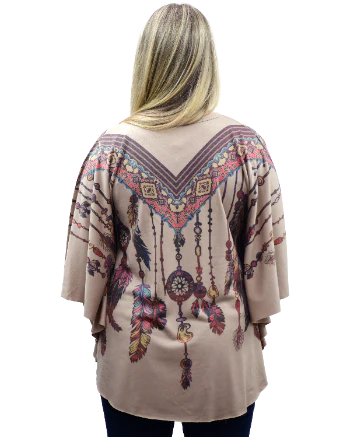 Naisten mokan värinen poncho kauniilla sulka- ja helmikuvioisella painatuksella. Mukavan pehmeää kangasta.