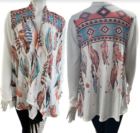 Ihanan kevyt ja pehmeä vaalea, edestä avonainen naisten jakku/neuletakki, jossa upeat sulka-aiheiset kuviot edessä ja takana. Erittäin joustavaa materiaalia.