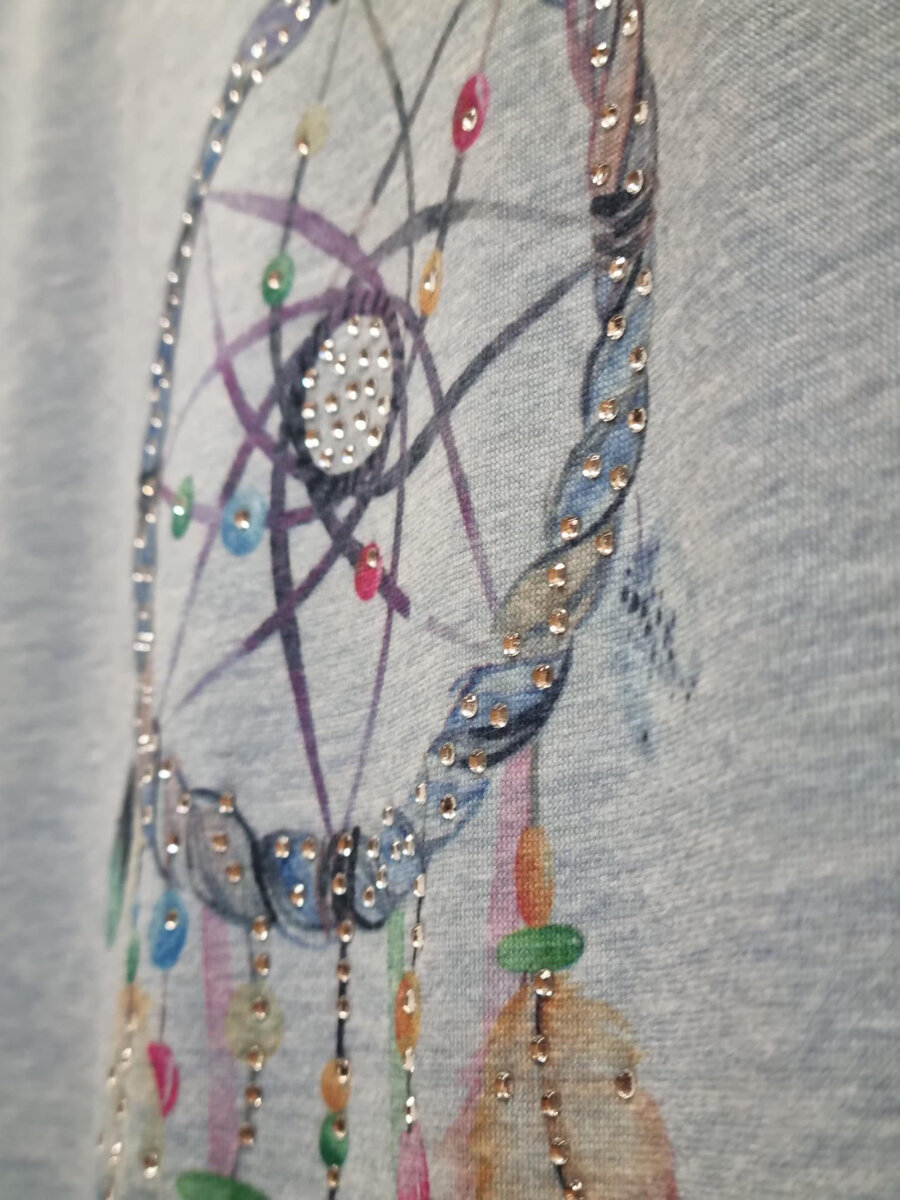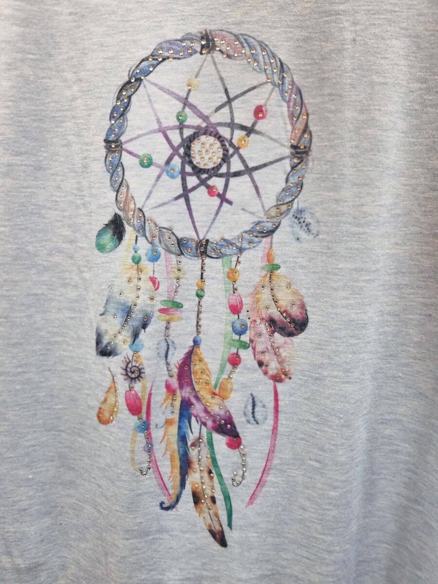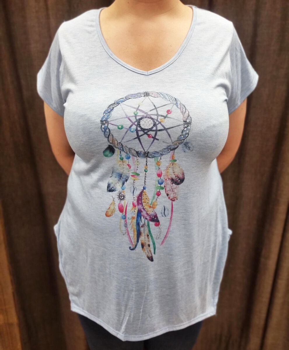 Meleeratun vaaleansininen naisten t-paita upealla unisieppari-painatuksella. Painatuksessa myös timantteja. Lyhyet hihat ja kaunis V:n muotoinen kaula-aukko. Edestä pidempi ja muotoiltu helma. Ihanan pehmeää ja mukavan tuntuista materiaalia.