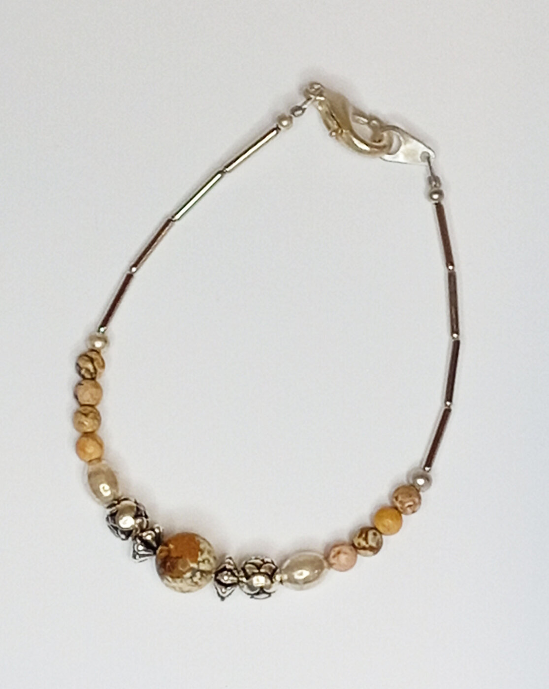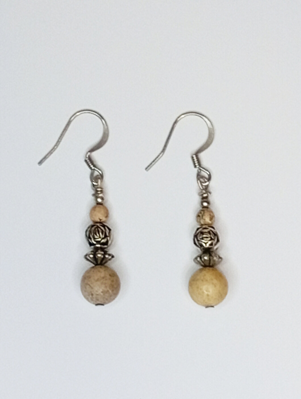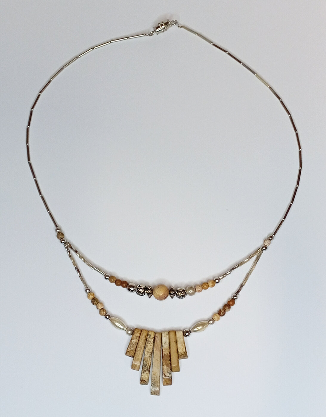 Hualapai Intiaanien käsityönä valmistama kaunis hopeakoru-setti luonnon läheisillä beigen ja ruskean sävyisillä Natural Brown Sand Stone -kivillä ja hopean sekä mustan sävyisillä koristehelmillä.