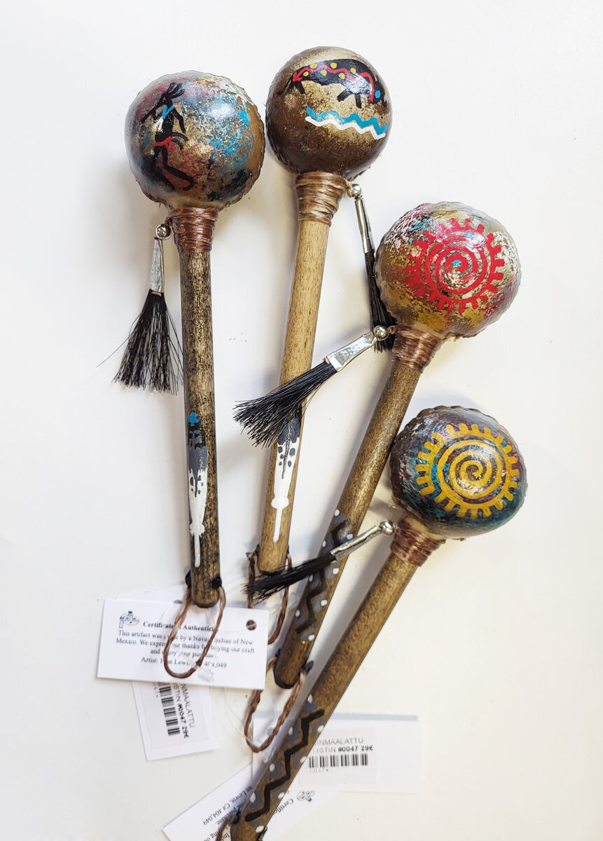 Navajo-intiaanien käsintekemä helistin, jossa ripustuslenkki. Kuvat käsinmaalattuja, erilaisia.