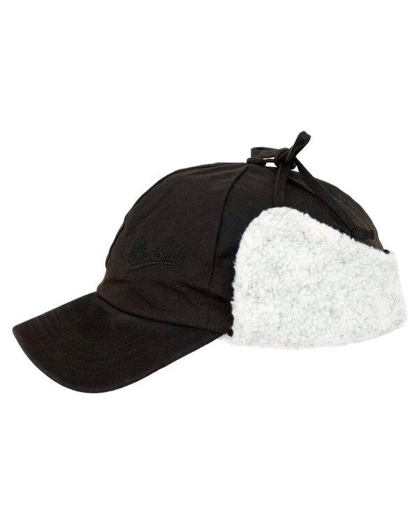 Upea Outbackin tumman ruskea vettähylkivä öljykangaslippalakki, jossa lämmin vuori ja karvavuoriset korvaläpät.