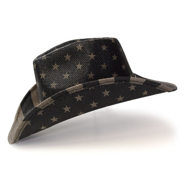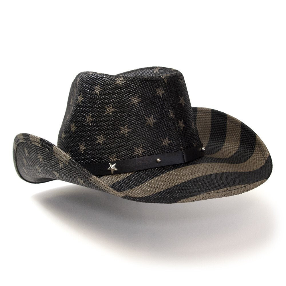Musta - harmaa olkihattu upealla Amerikan lippu kuvioinnilla. Keinonahkainen hattupanta metallisilla pyöreillä ja tähden muotoisilla niiteillä.