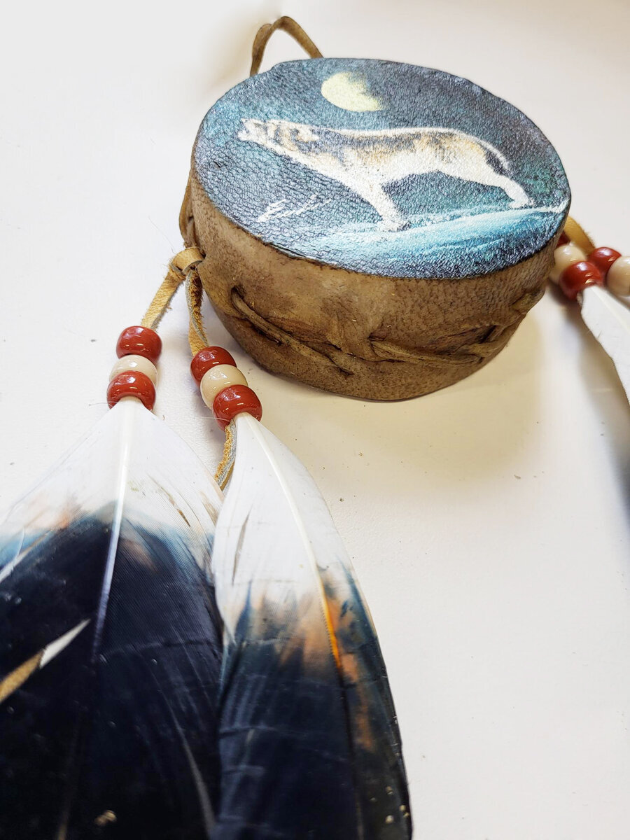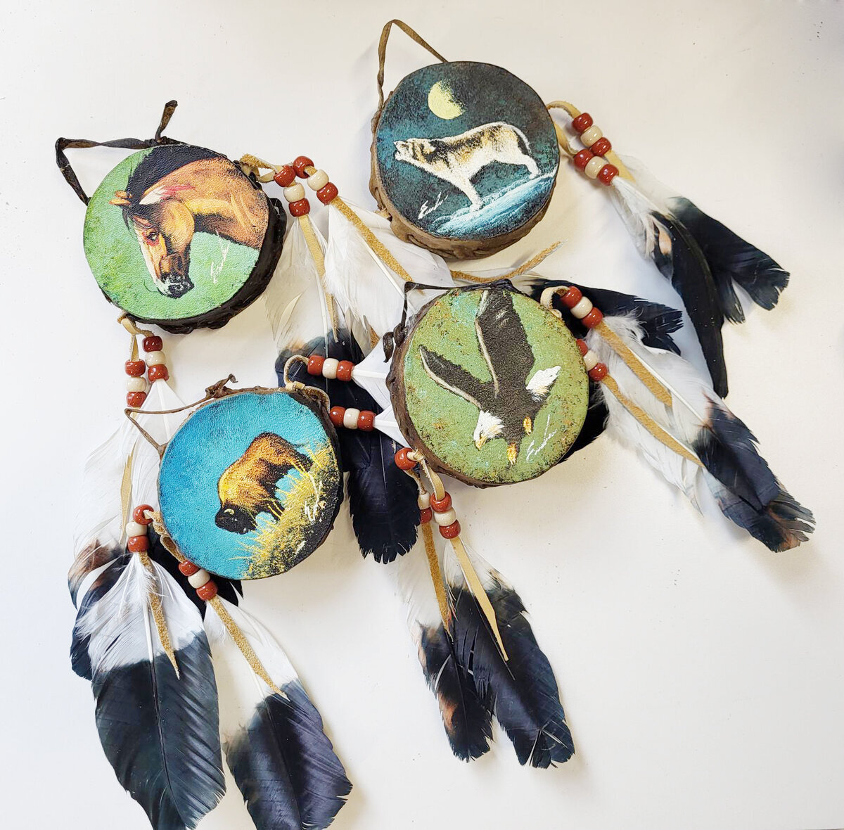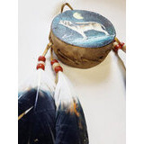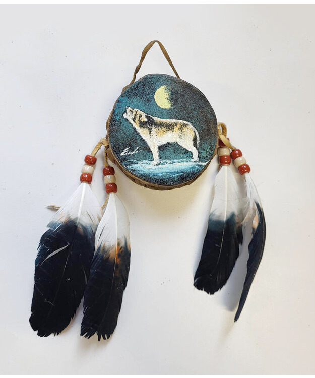 Navajo-intiaanien käsintekemä rumpukoriste, jossa ripustuslenkki. Kuvat käsinmaalattuja, ja sen vuoksi erilaisia. Valittavana olevat kuvat ovat eläinten pää- ja kokokuvia, voi vaihdella mallikuvasta.