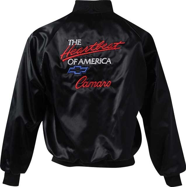 Musta satiininen pilottitakki, jossa selässä iso brodeerattu logo, ja edessä rinnassa sama logo pienellä.Saatavilla koot S ja 3XL