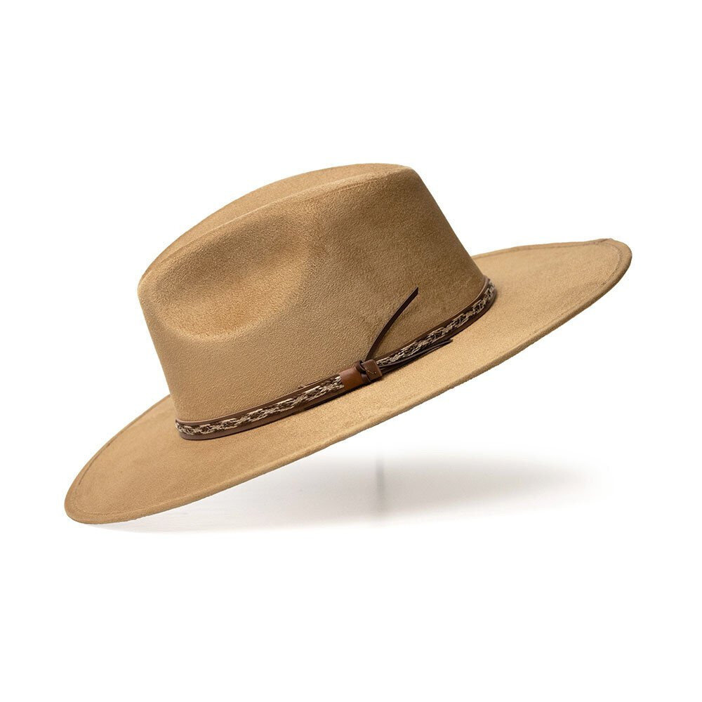 Muotoiltu, jäykkä, suoralierinen, polyesterinen westernhattu, jossa pintamateriaali kamelin väristä mokkajäljitelmäkangasta. Hatussa koristeena keinonahkainen hattupanta punotuilla yksityiskohdilla.