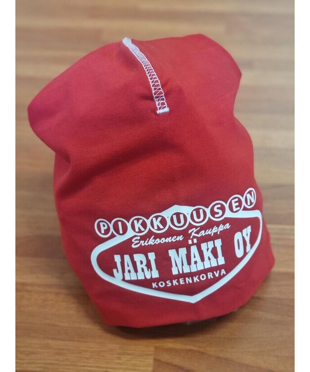 Punainen trikoopipo, jossa painettu kuvio ja valkoiset saumat.