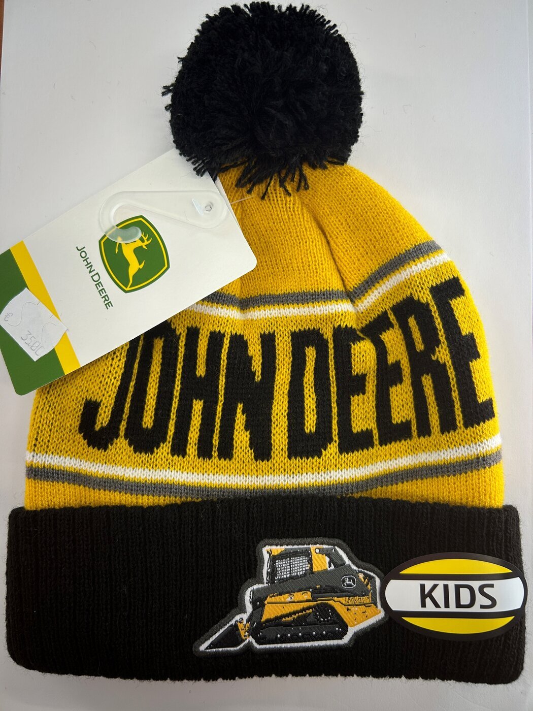 Lasten John Deere tupsupipo, jossa John Deere teksti edessä ja takana.