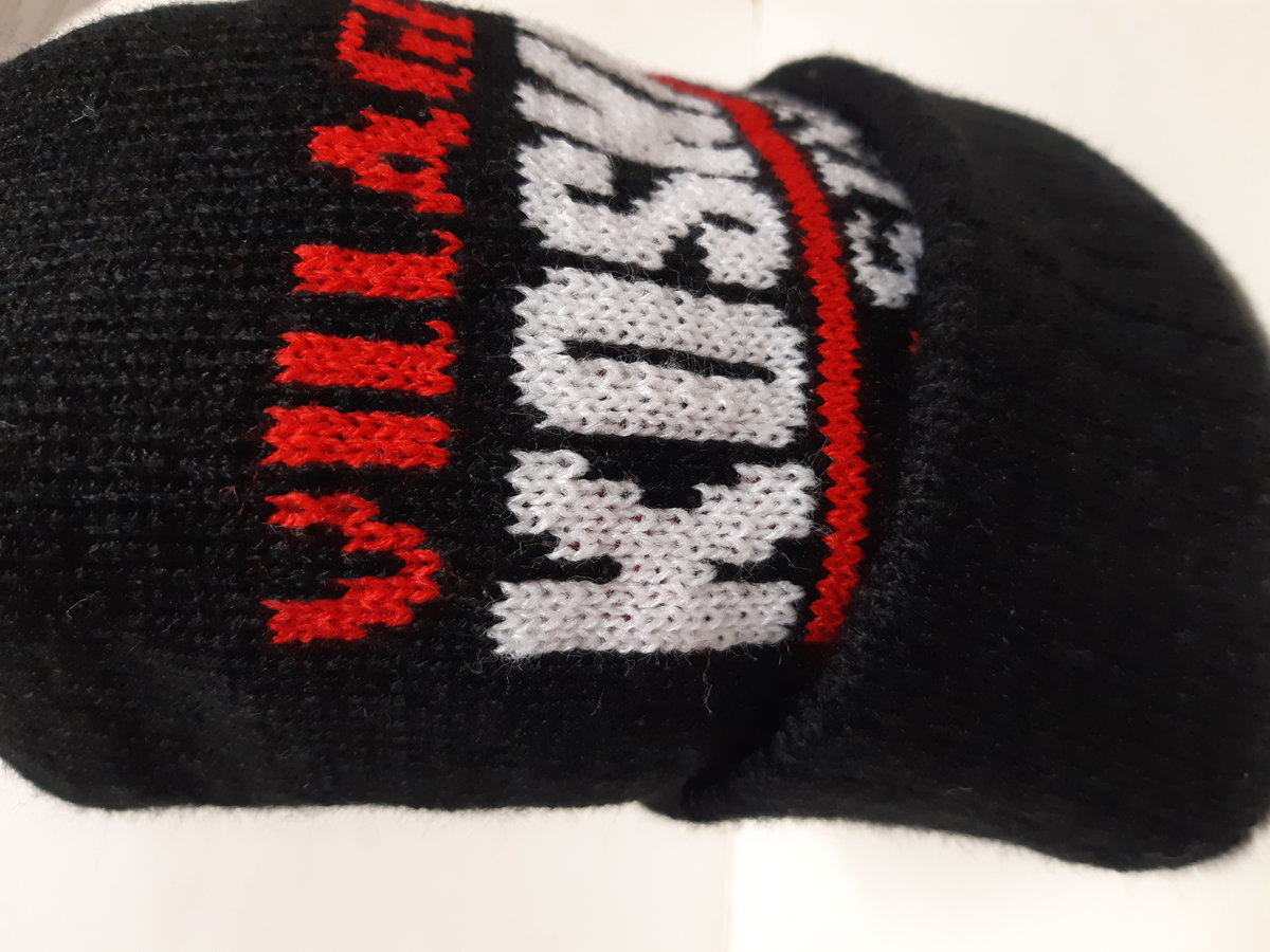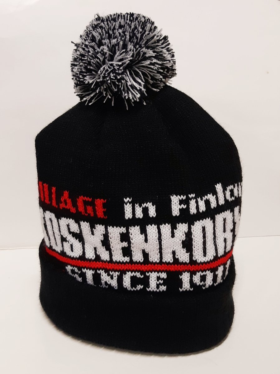 Musta neulottu pipo tupsulla. Pipossa teksti "Village in Finland, Koskenkorva, Since 1911".