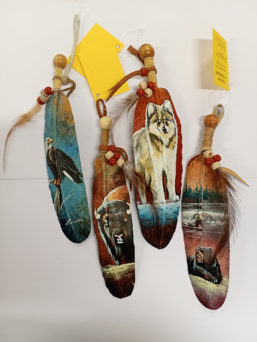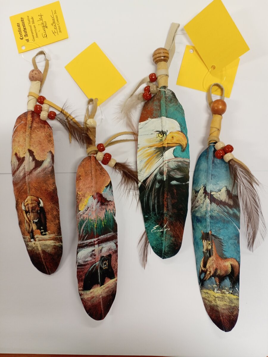 Navajo-intiaanien käsintekemä rukoussulka-koriste, jossa ripustuslenkki. Kuvat käsinmaalattuja, ja sen vuoksi erilaisia. Valittavana olevat kuvat ovat eläinten pää- ja kokokuvia, voi vaihdella mallikuvasta.