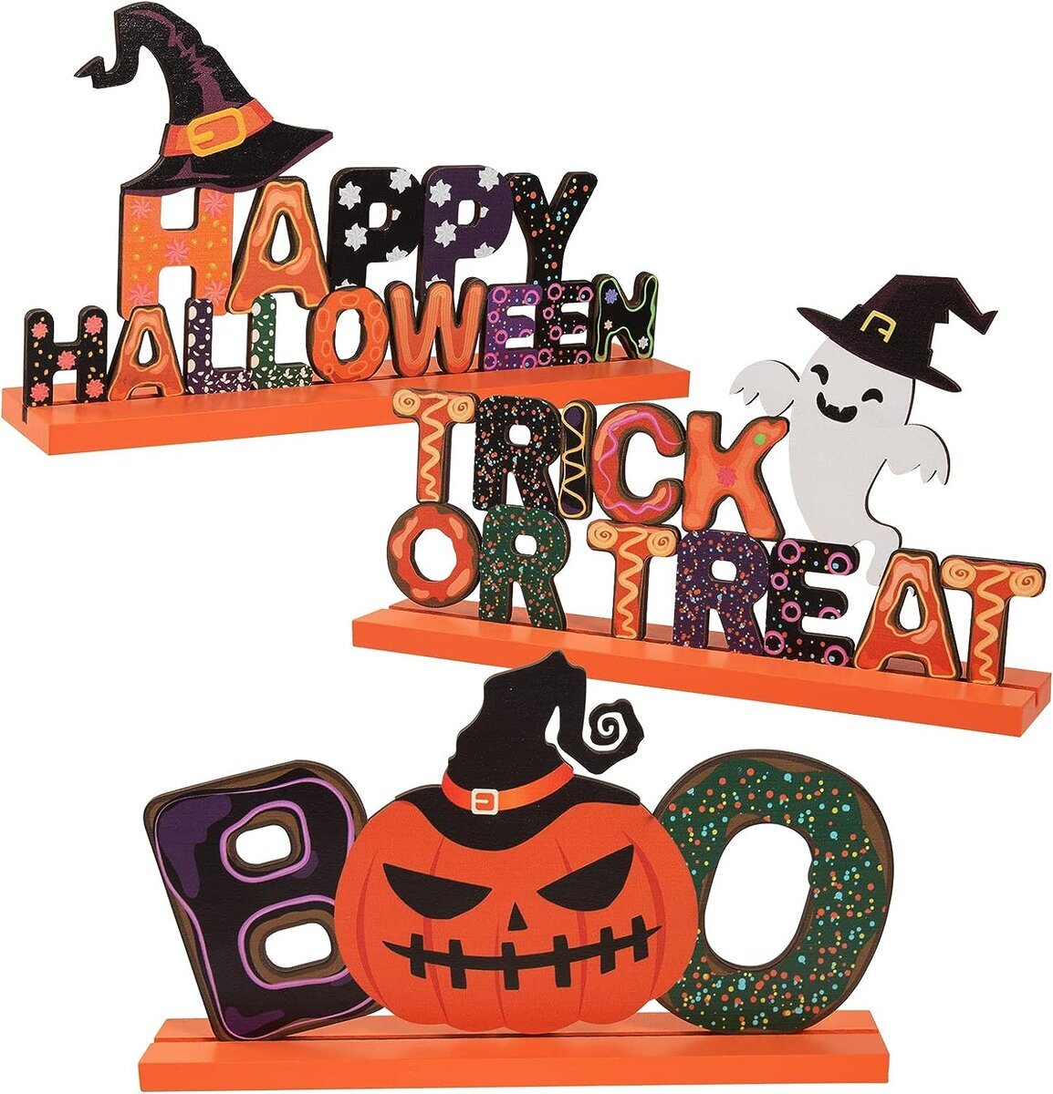 Halloween-aiheinen pöytäkoristesetti. Pakkaus sisältää 3 erilaista.
