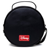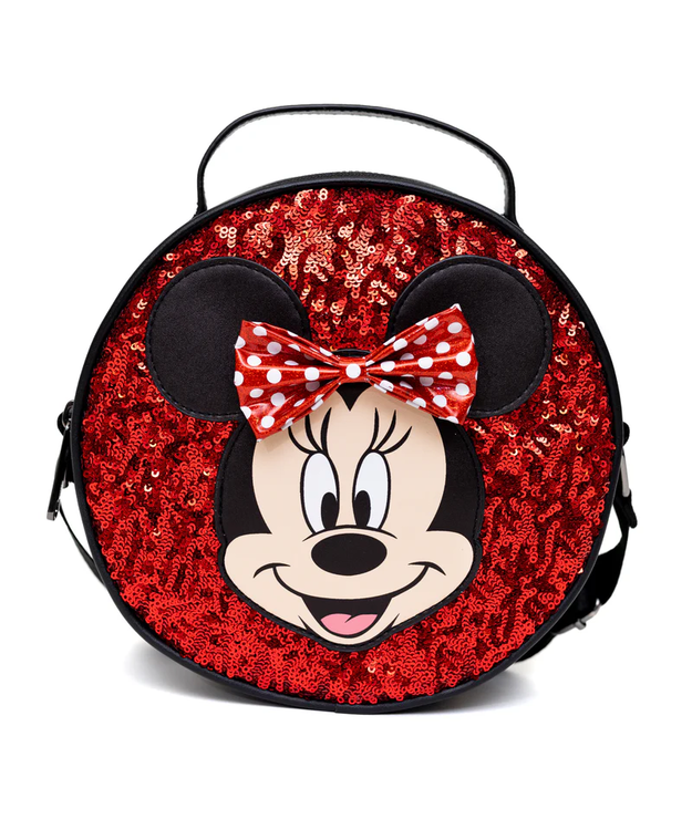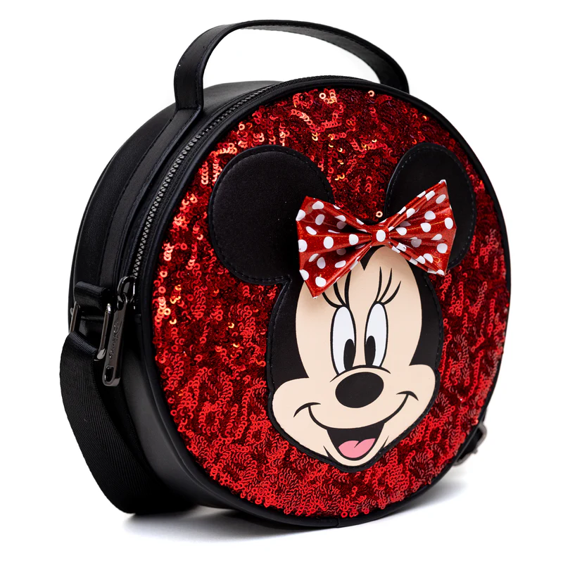 Söpö pyöreä Minni Hiiri -laukku. Etuosassa kuvan taustalla punaista paljettia, sivut ja takaosa mustaa vegaanista "nahkaa". Säädettävä pidempi hihna turvavyö-materiaalia, sekä pieni kantohihna. Vetoketjullinen päälokero ja sisällä pieni avonainen tasku.