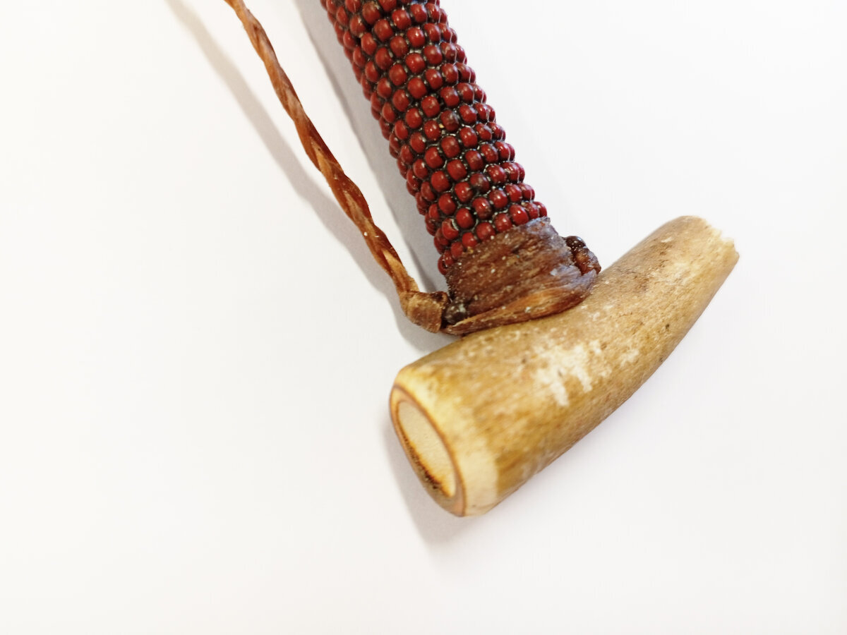 Materiaalit: Puu, nahka, luu/sarvi, lasihelmet.