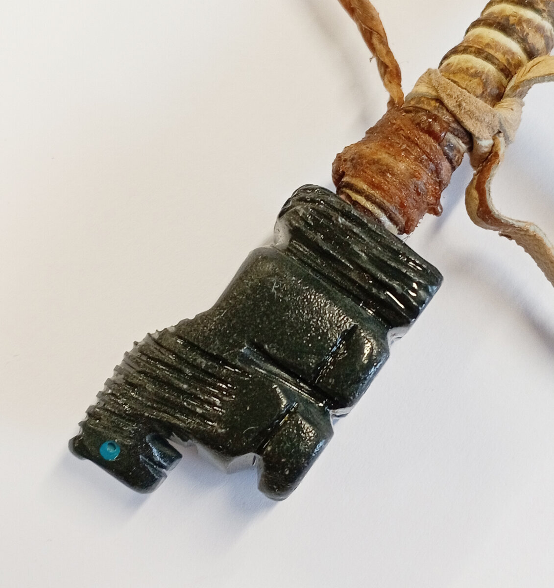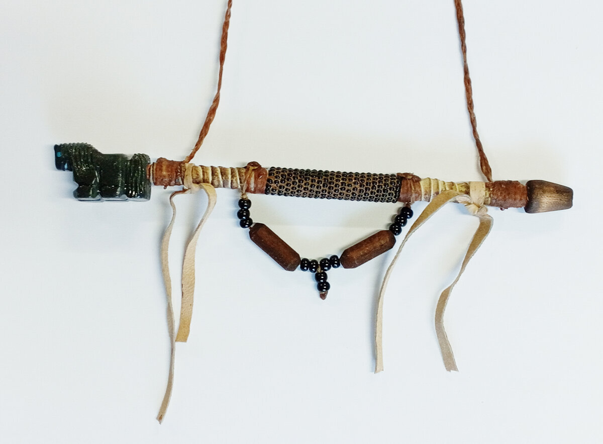 Navajo-intiaanien käsintekemä rauhanpiippu, jossa piippuosa kivestä veistetty eläin, ripustuslenkillä.