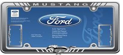 Kromin värinen, metallinen rekisterikilven kehys Mustang tekstillä ja hevoslogolla.