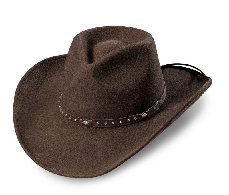 Muovattava villahuopahattu sisävuorella ja laadukkaalla nahkaisella hattunauhalla jossa conchoja.