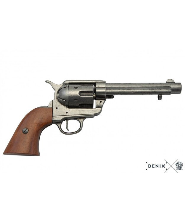 Tarkka kopio alkuperäisestä revolvelista. Toimivat mekanismit..45 caliberPituus: 30,5 cmMateriaali: Metalli, puu (kahva).Replica-aseet saatavilla taulun / telineen kanssa lisähinnasta. Taulu on valmistettu lähes 100 vuotta vanhasta, ajan patinoimasta laudasta. Luodin malliset kiinnikkeet kuuluvat hintaan.