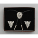 Kirkkaan valkoinen, tummanharmailla yläosan ja hiojen brodeerauksella