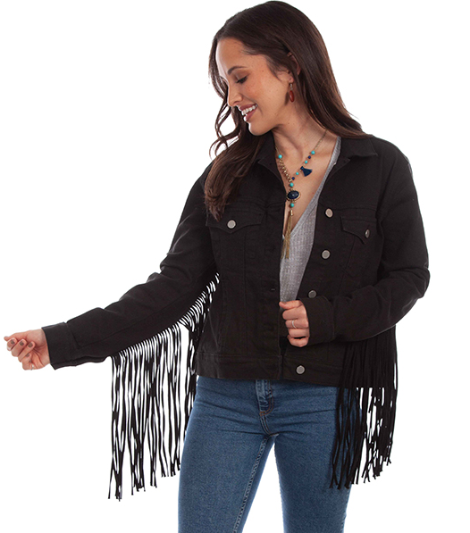 Scullyn tyylikäs musta farkkutakki pitkillä hapsuilla selässä ja hihoissa.