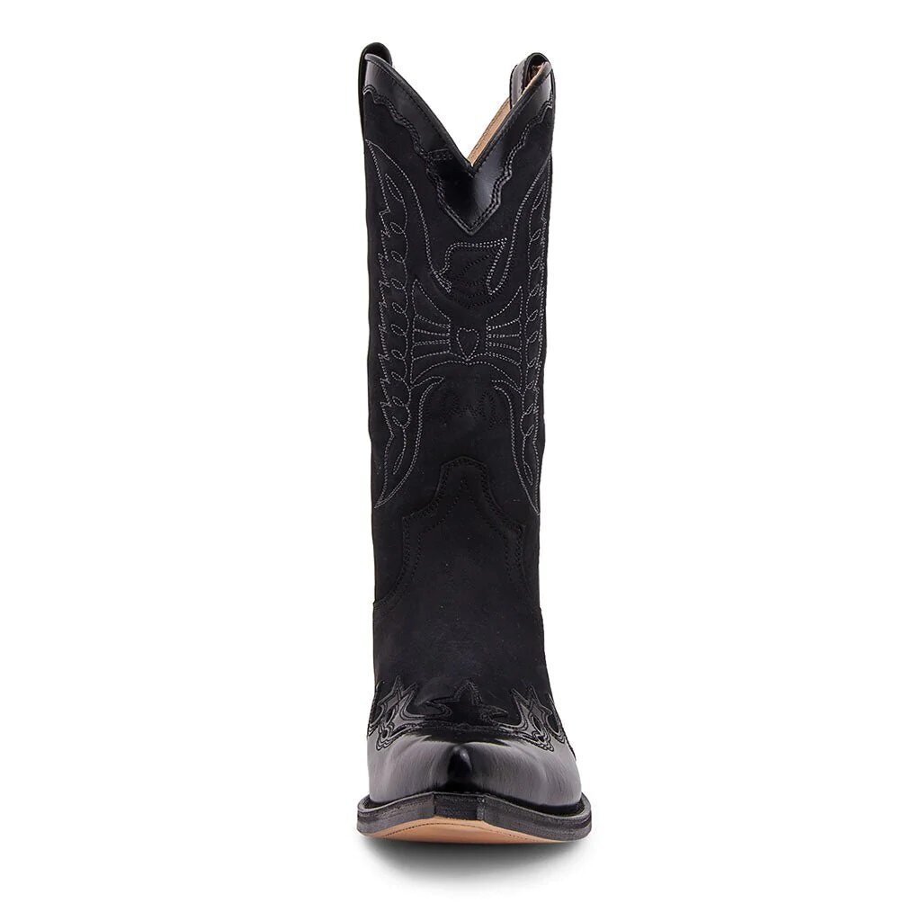 Sendran unisex-malliset pitkävartiset bootsit koristelluilla terävillä kärjillä. Kengissä kahta erilaista mustaa nahkaa; kiiltävää ja mattapintaista. Kauniit koristeompeleet.