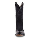 Pitkävartinen, teräväkärkinen musta bootsi kuvioidulla kärjellä