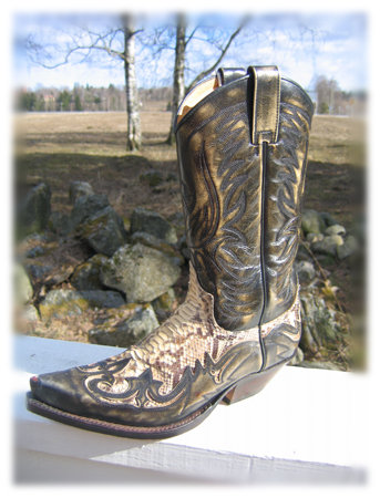 Sendran upea unisex pitkävartinen teräväkärkinen kuvioitu bootsi. Kulutetun näköistä nahkaa, jalkaterä osa aitoa pytonin nahkaa, jonka sävy saattaa vaihdella.