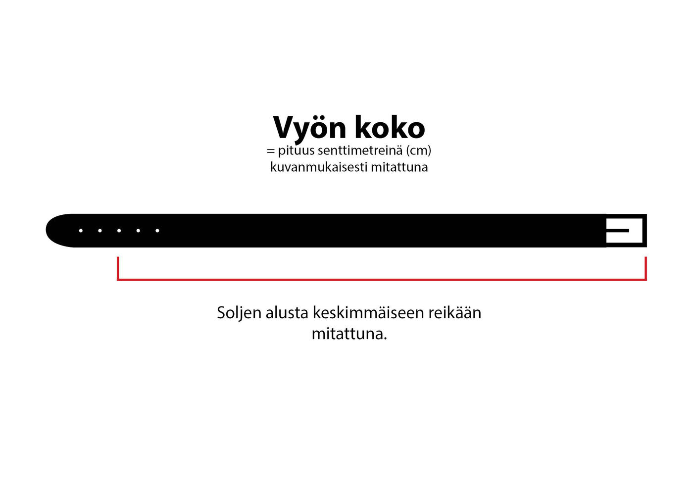 Vyön kokonaispituus on n. 10 cm pidempi, kuin ilmoitettu koko.