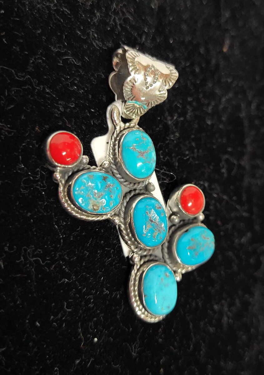 Kaunis ja varmasti uniikki riipus sterling hopeaa, jossa Sleeping Beauty turkooseja sekä punaista korallia.