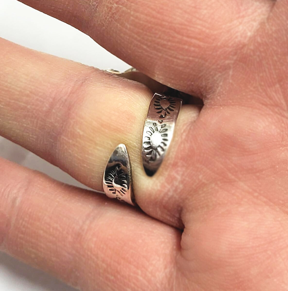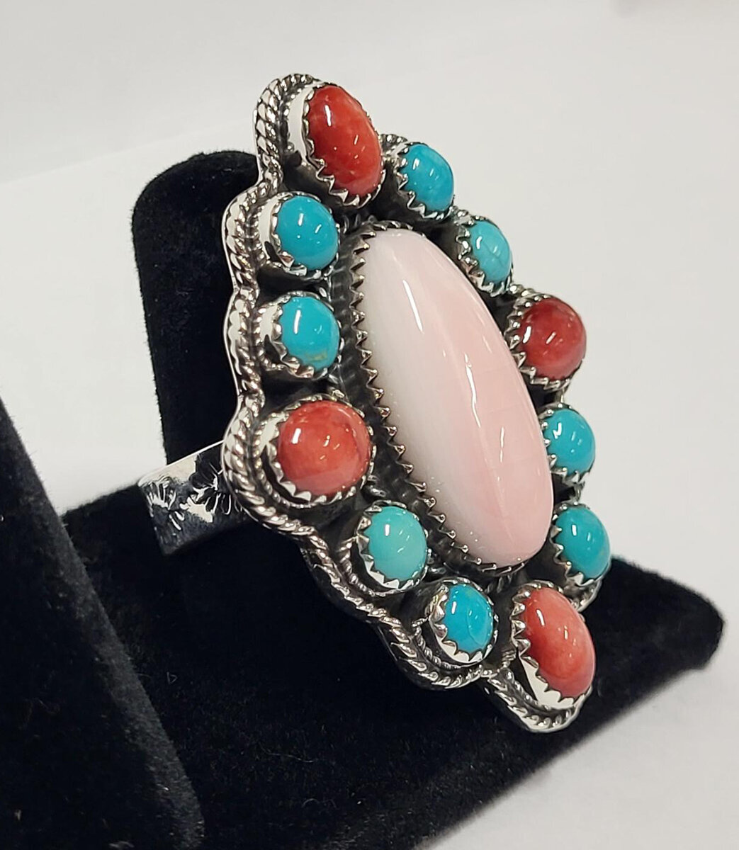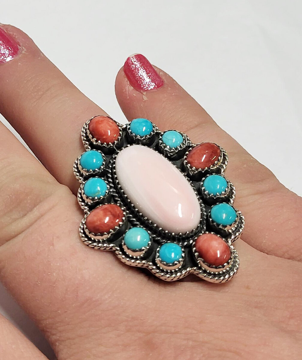 Upea ja uniikki sterling hopeaa oleva sormus, jossa Sleeping Beauty -turkooseja sekä simpukkaa (punaiset Spiny Oyster ja vaaleanpunainen Conch shell).