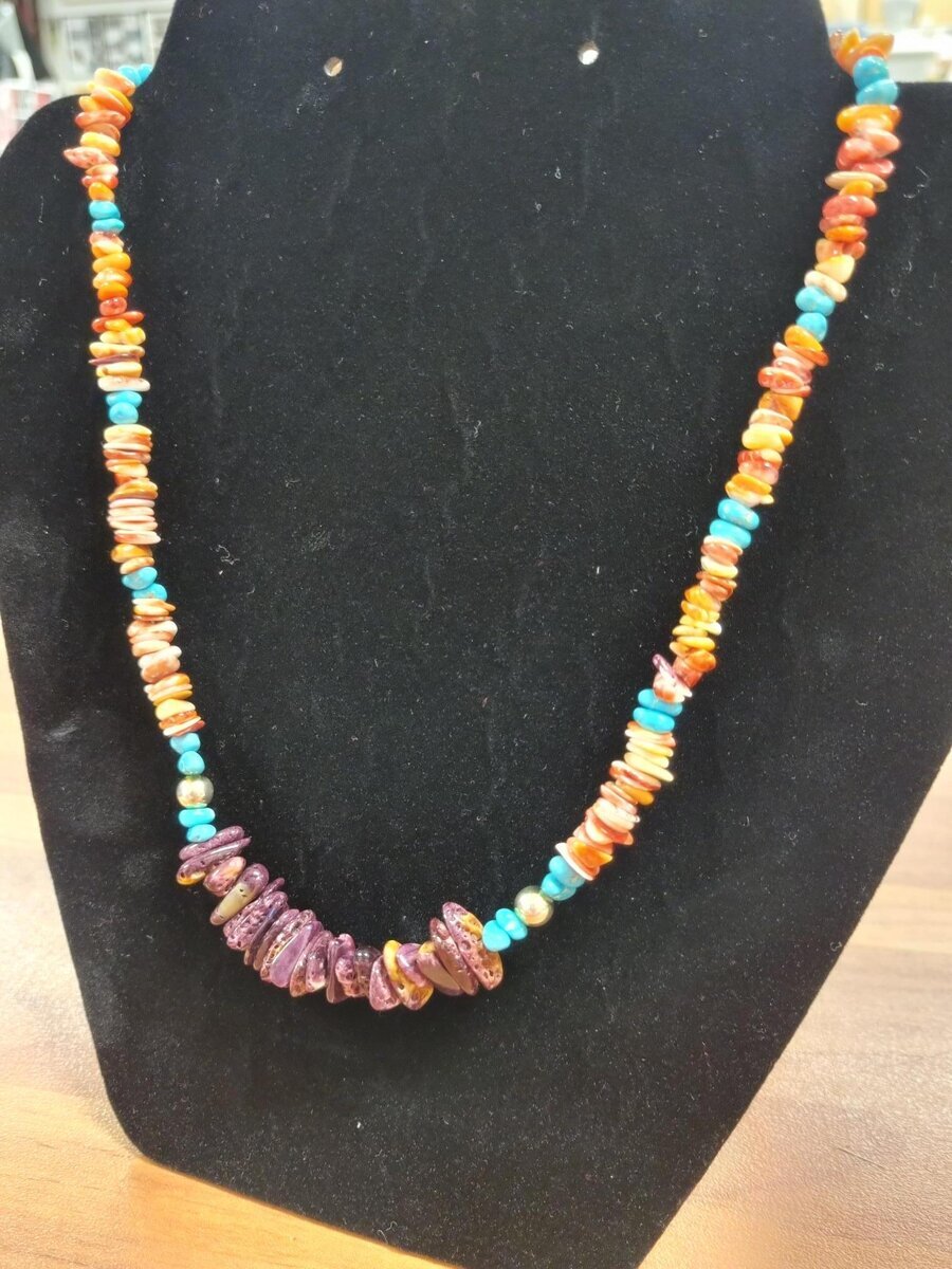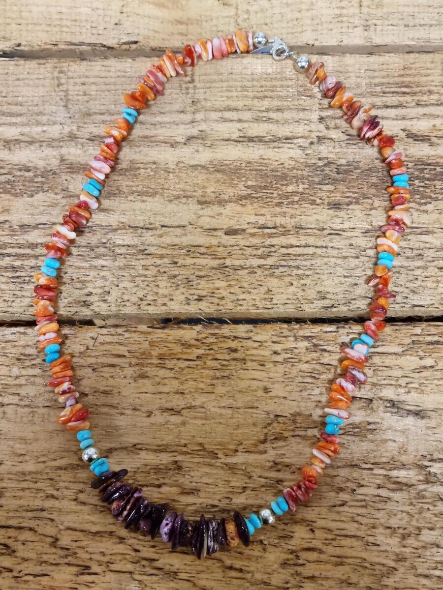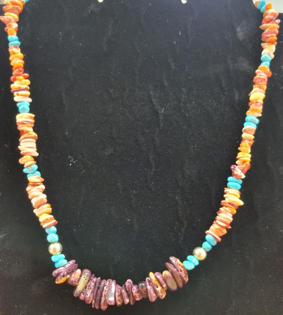 Upea monivärinen kaulakoru, jossa turkoosit osat ovat Sleeping Beauty Turquoise -kiveä. Oranssi on Spiny Oyster-simpukkaa ja violetti on värjättyä Spiny Oyster -simpukkaa. Metalliosat stearling hopeaa.