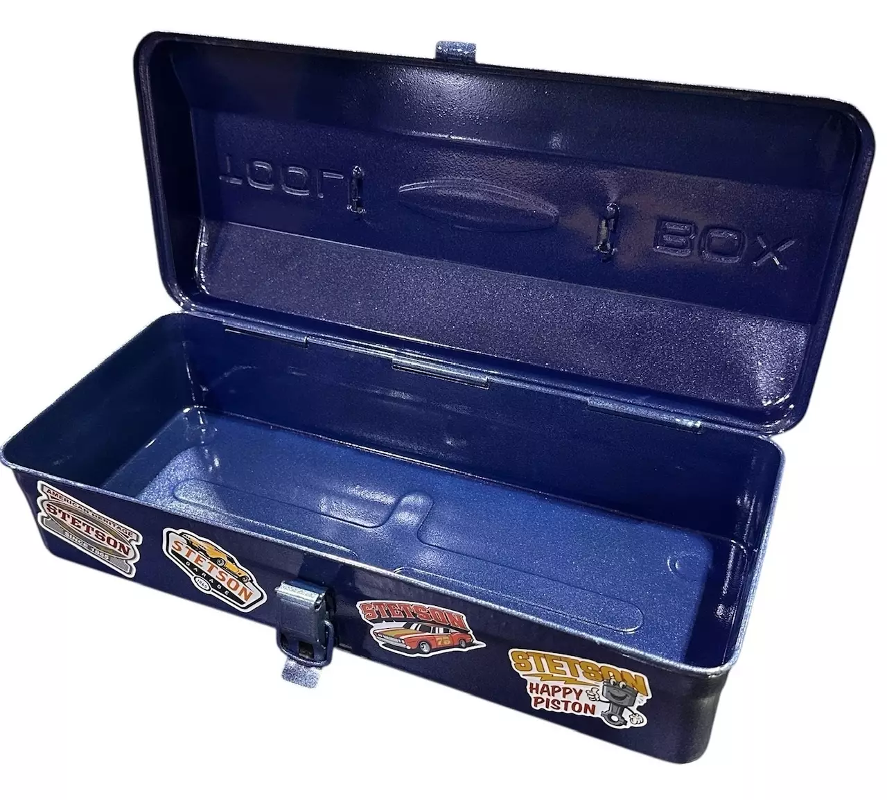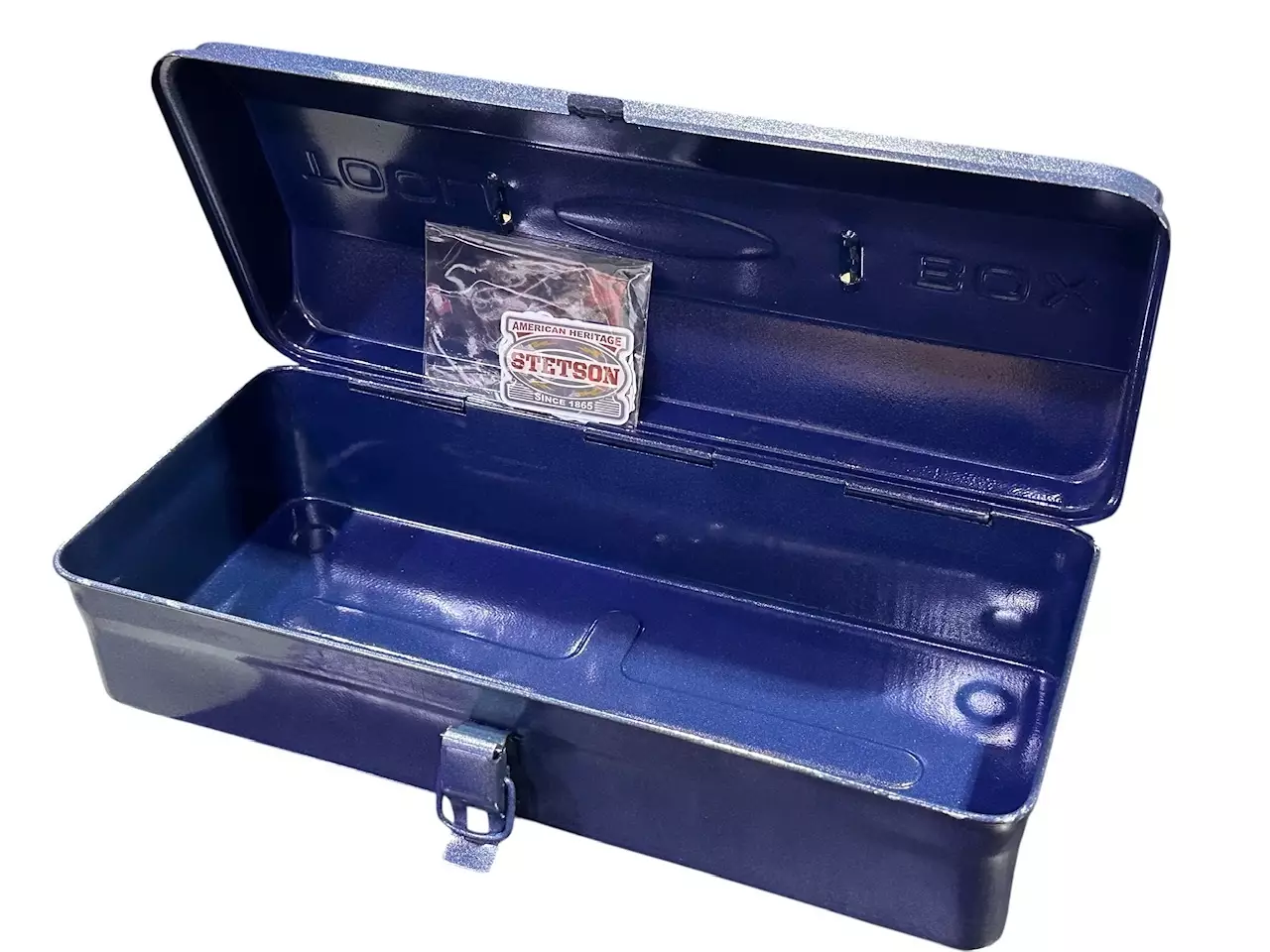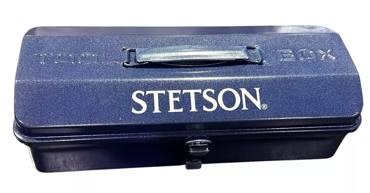 Kannen päällä kohokuvioitu teksti tool box ja painettuna Stetson-teksti. Nivelsalpa suljenta, jossa paikka riippulukolle.