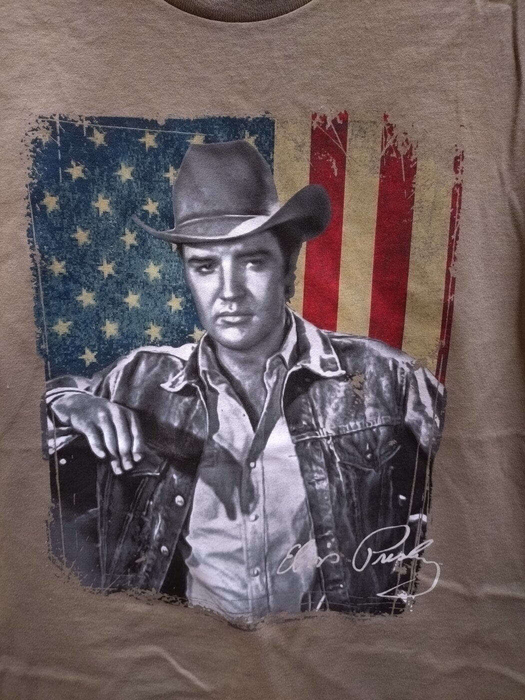 Khakin värinen, perusmallinen t-paita, jossa Elvis Presley Cowboy-asussa Amerikan lipputaustalla.