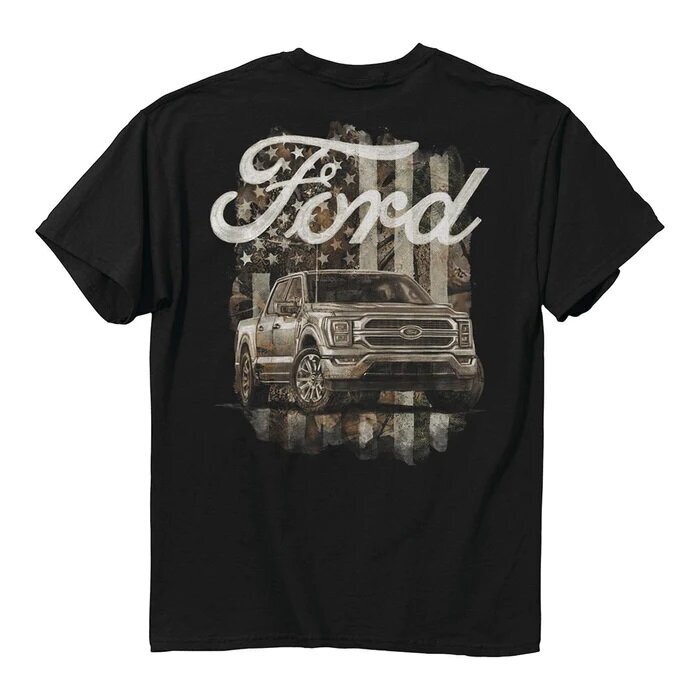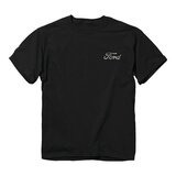 Musta perusmallinen T-paita. Etupuolella rinnassa pieni merkki, isompi kuva takana.