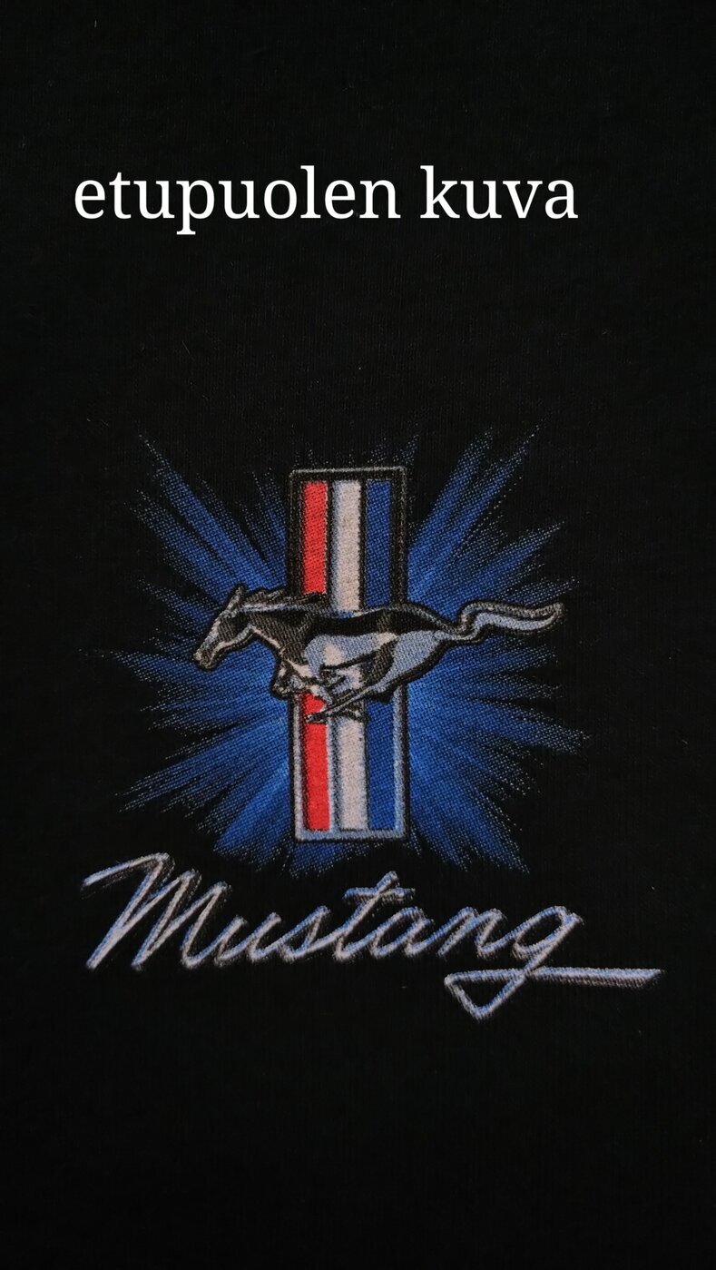 Etupuolella vasemmalla puolella rinnassa pieni logo ja teksti, selässä isompi kuva.