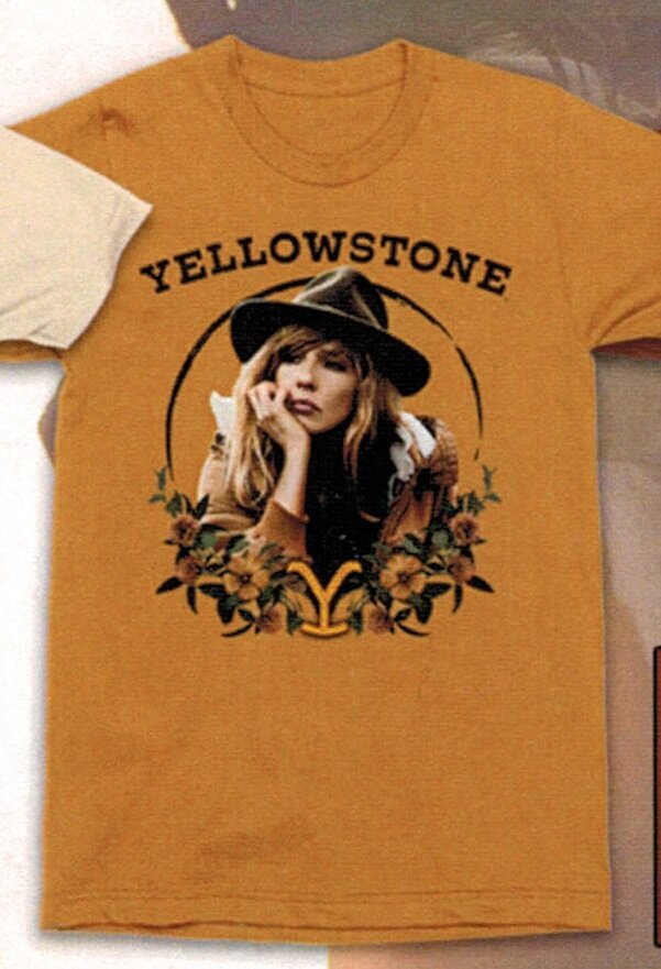 Sinapinkeltainen perusmallinen T-paita, jossa Yellowstone-aiheinen painatus edessä.