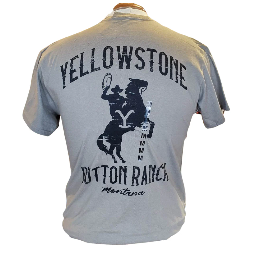 Unisex-mallinen T-paita, jossa Yellowstone-aiheiset painatukset, edessä pienempi ja selässä isompi.